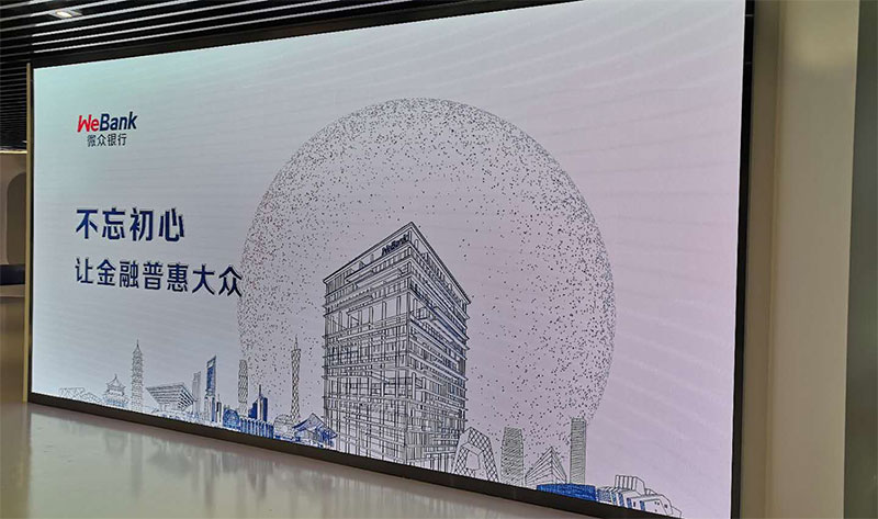 深圳前海微众银行室内P2全彩LED显示屏案例采用了P2高清全彩LED显示屏方案,项目面积约26.2平米。